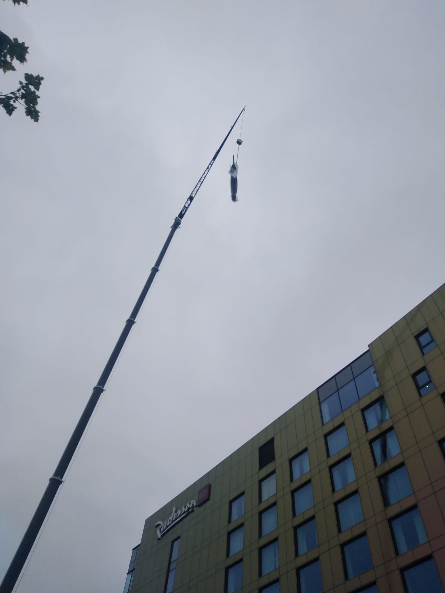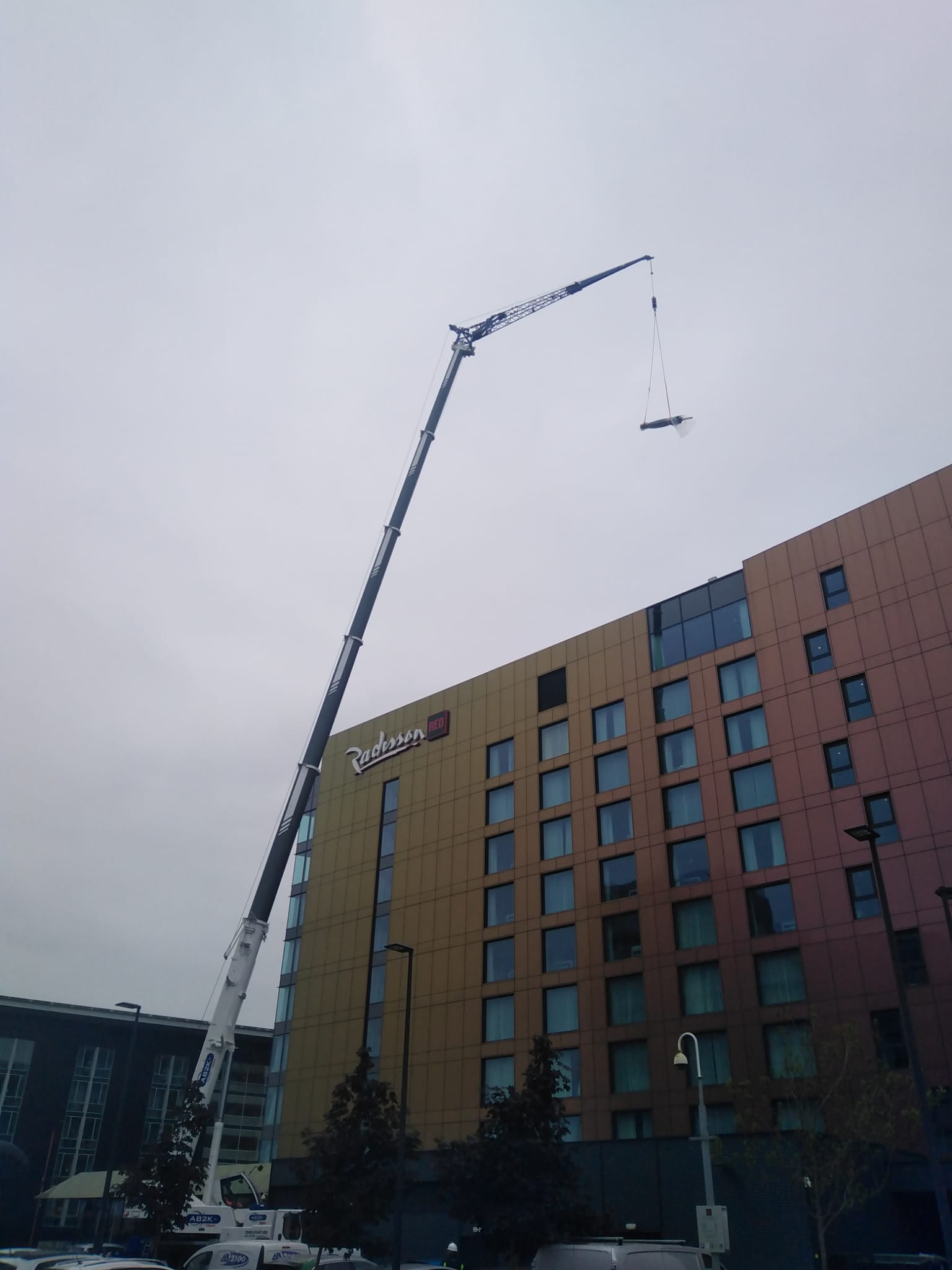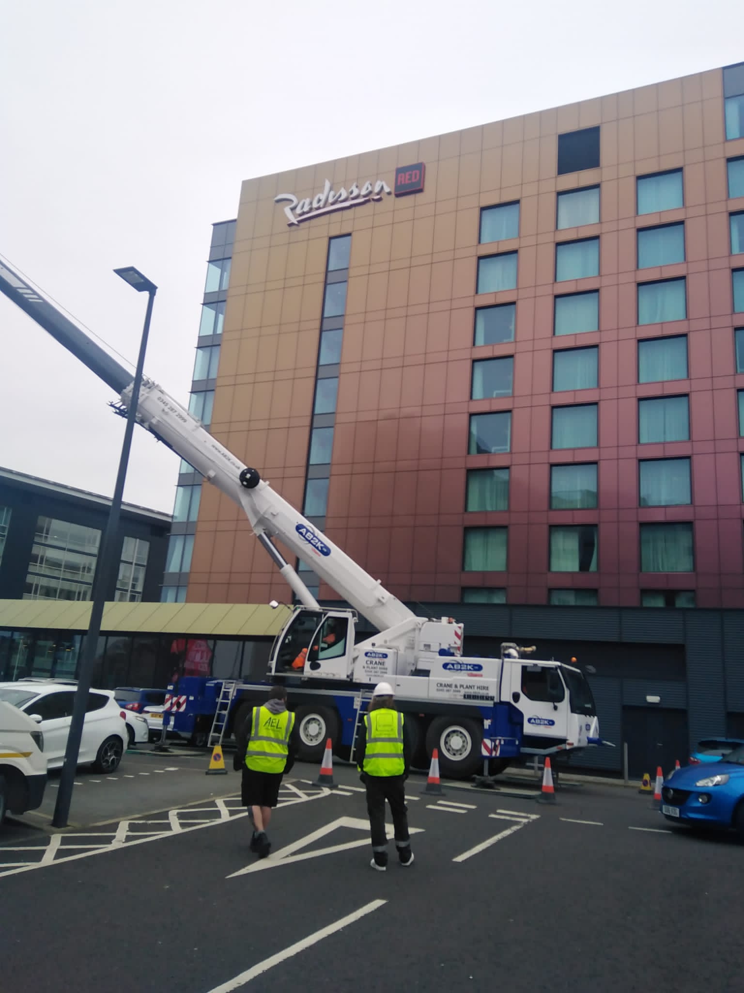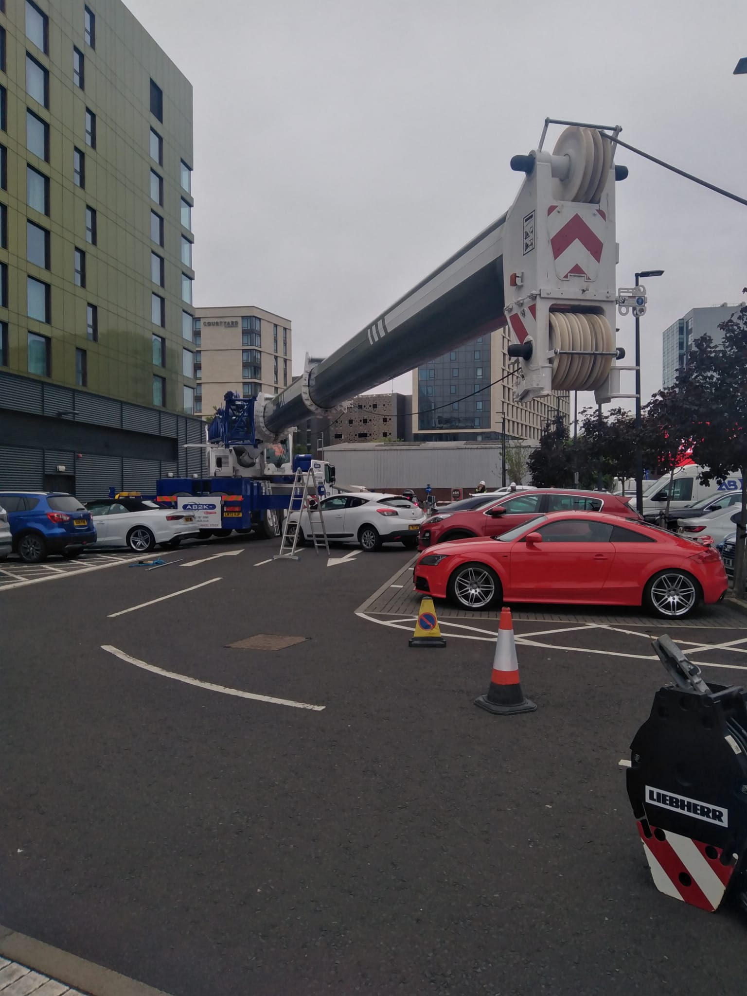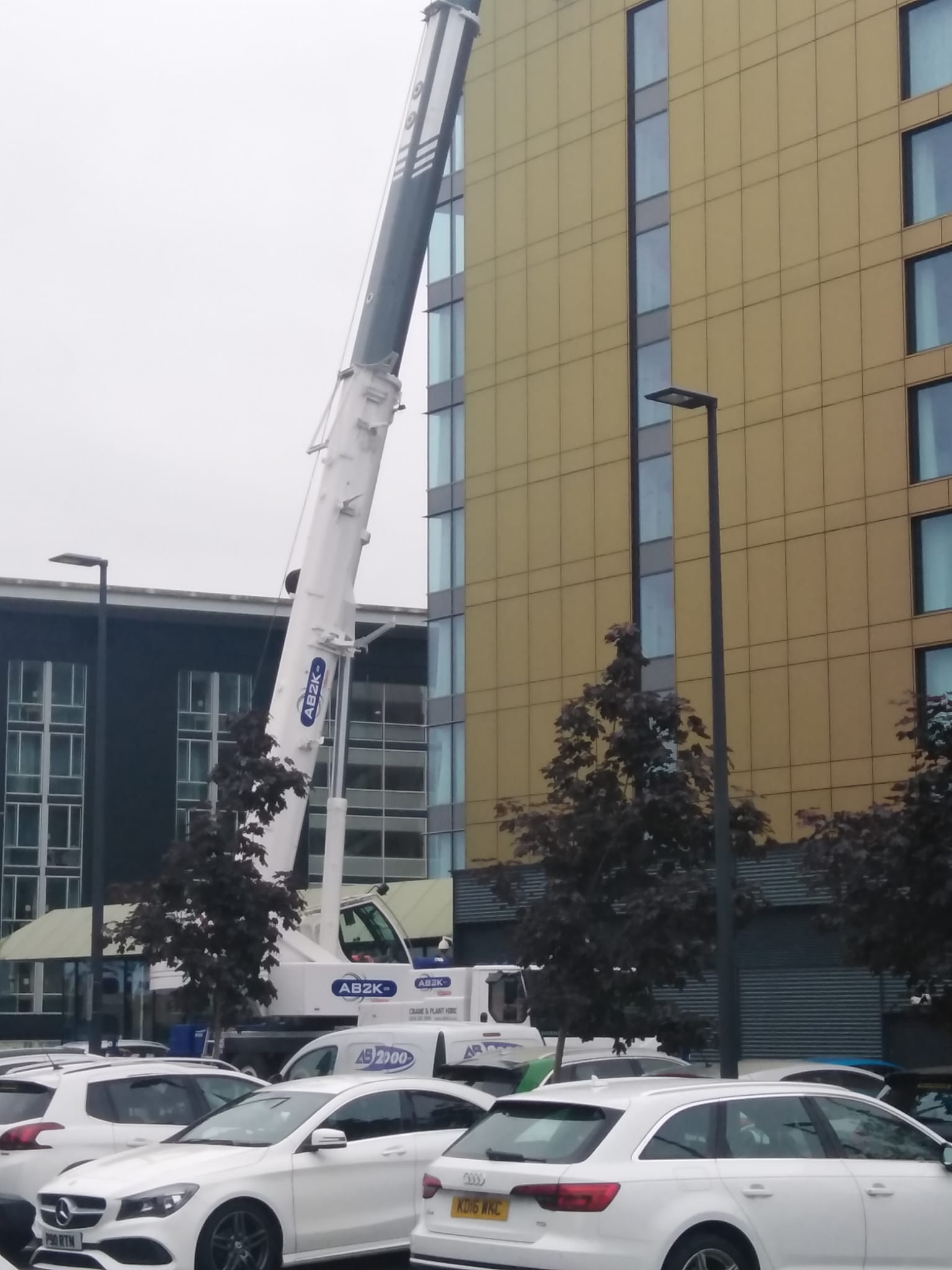 AB2K was called in to retrieve it using the 70t crane extending 46m boom plus 16m fly jib at 40 degrees offset working at 35m lift radius. The pictures show the 4m parasol being securely lifted and transported back to ground. After finishing the job, the AB2K flexible Liebherr crane was retracted back into position, then its wheels down for a drive back to base. As you can see from the carpark shots AB2K road cranes can work in the tightest spots as space available on sites is often constricted.