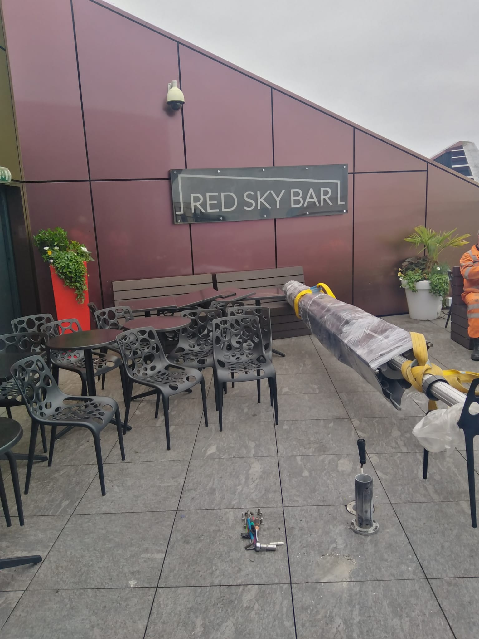 There's a very special parasol nine floors up in Glasgow's most stylish nightspot The Red Sky Bar at The Radisson Red hotel. It was installed when the hotel was built in 2018. It has integrated lights and heaters, making it exceptionally heavy. When opened it can withstand winds up to 55mph - very handy for the wonderfully seasonal Glasgow weather. It's an enormous one-piece parasol and too big to be taken in the stairs or lift.